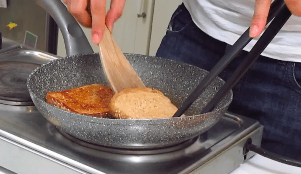 Ecima de la sartén junta de mantequilla le ponemos el pan. Hacemos dorar el parar el pan por ambos lados y lo servimos.