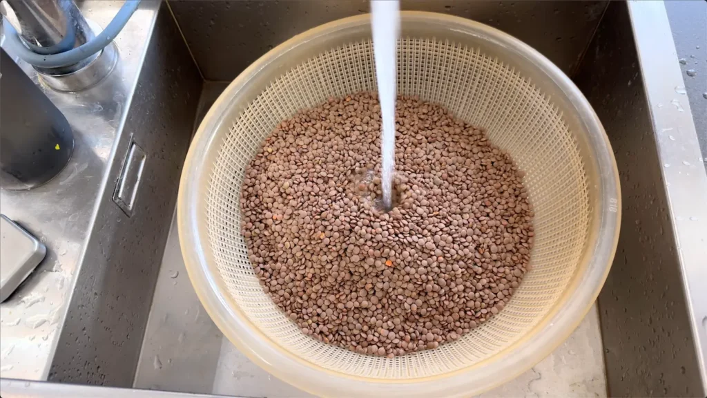 Lavamos bien las lentejas bajo el grifo y las dejamos escurrir mientras preparamos las verduras.