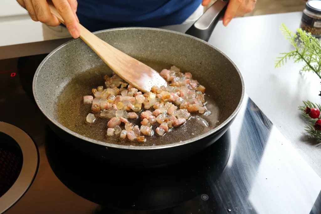 - Corta el guanciale en cubos pequeños y dóralo en una sartén con una gota de aceite de oliva.![]()