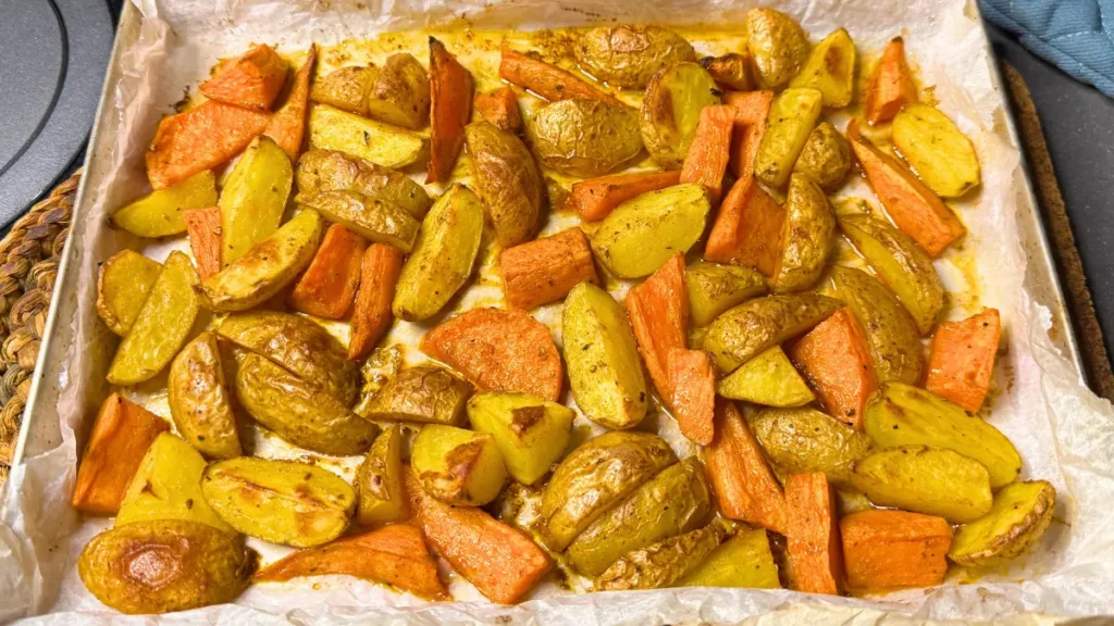 Palabra clave batata al horno, guarnición saludable, patatas y batata al horno, verduras al horno
