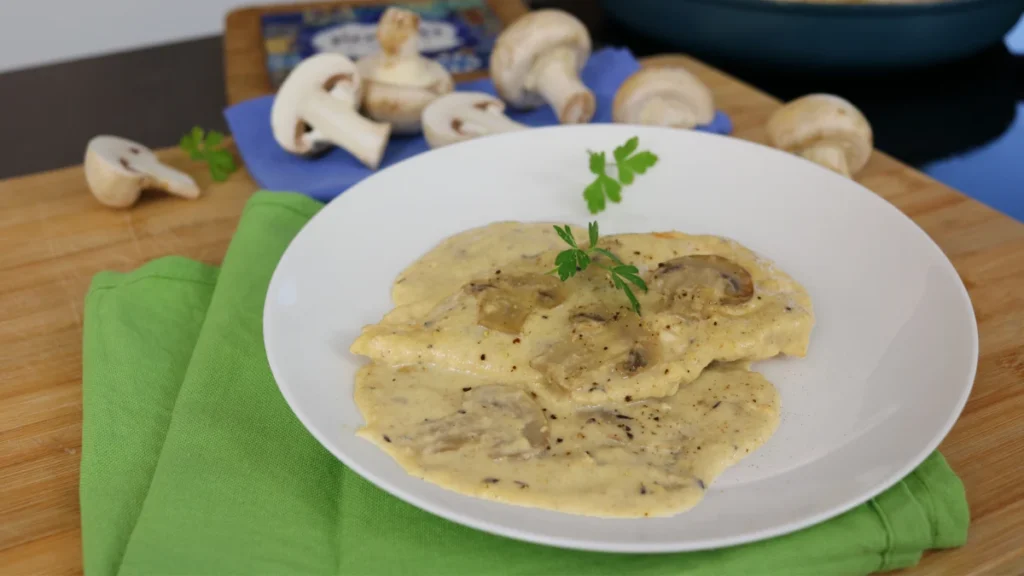 Este plato de pollo con champiñones es muy fácil de preparar y su sabor conquista cualquier paladar. Lo que mas me gusta es la crema de champiñones que deja la pechuga de pollo muy jugosa.
