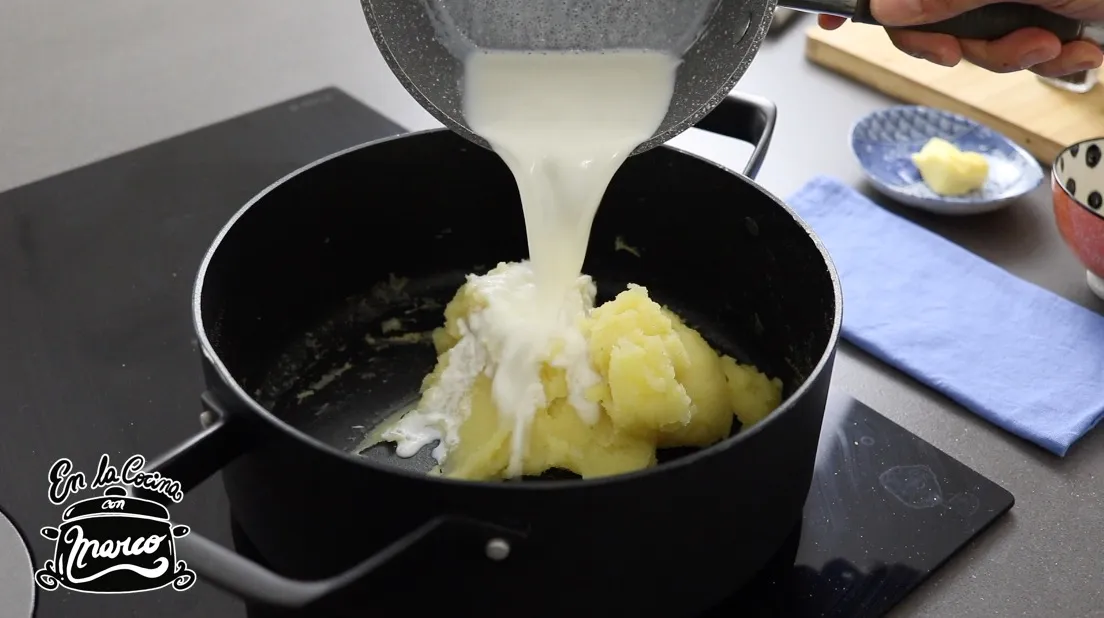 8) A parte calentamos la leche, sin esperar que hierva, y la agregamos adentro de las papas.