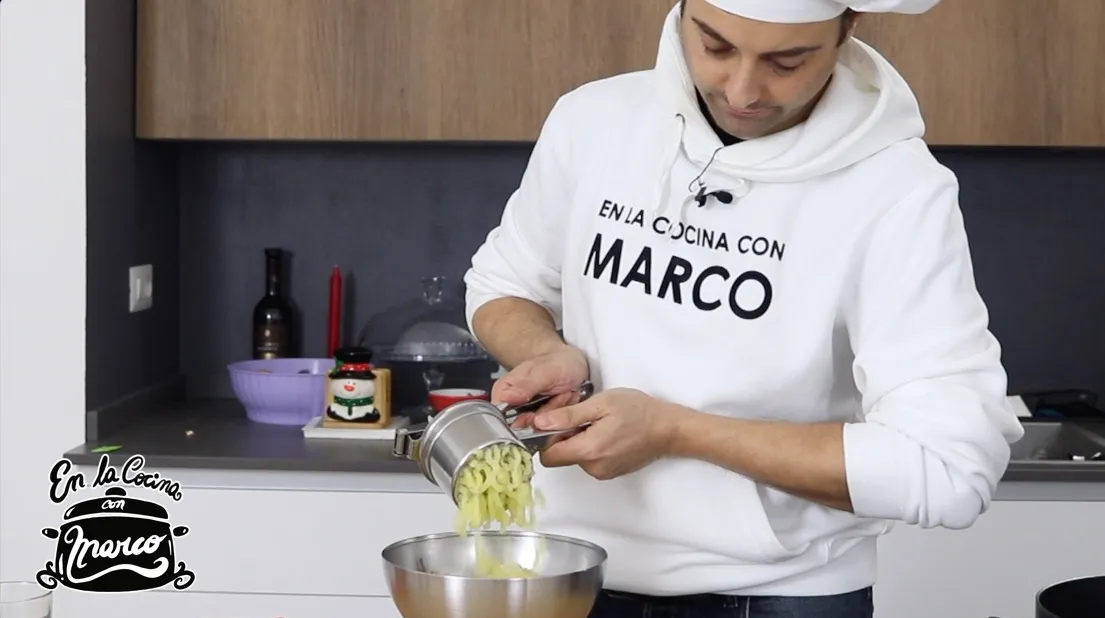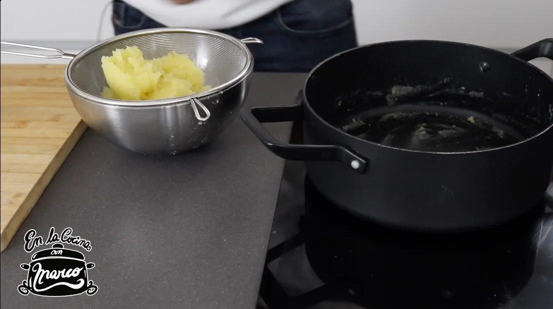 5) Pasamos las papas dentro de un prensapapas. Si no lo tienes podrás aplastarlas con un tenedor.