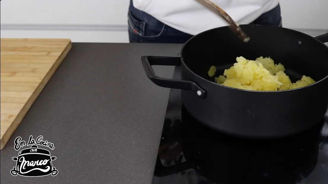 6) Una vez aplastadas, pasamos nuestras papas dentro de una olla baja, o una sartén alta. Aprendemos el fuego a una intensidad medio baja.